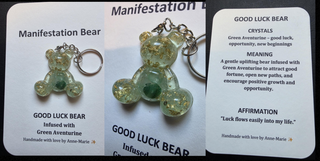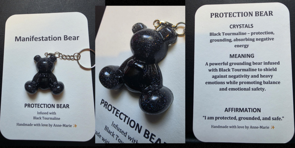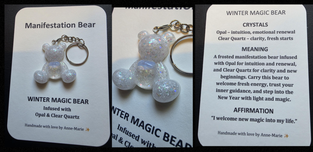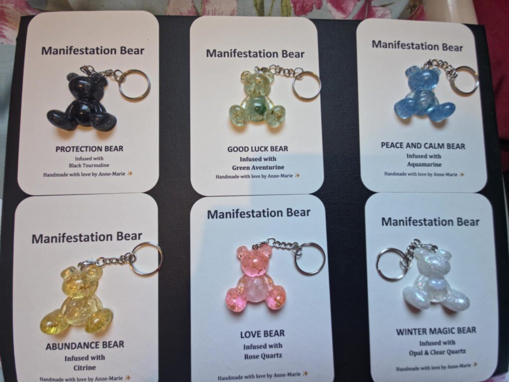 Each bear is lovingly handmade using resin and real crystals, chosen for their unique energy and meaning.